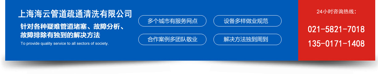 上海海云管道疏通清洗有限公司是一家集市政管道清洗、工业管道清洗、管道机器人检测、管道维修、环卫吸污、家政服务、管道疏通、非开挖工程施工为一体的综合性服务公司。公司拥有各种大中小型的先进管道疏通机、化学疏通剂等各种疏通设备,专业疏通各种厂矿、居家、宾馆、门店的大小下水道、马桶、浴缸、地漏、组合试下水道等。 长期清理化粪池、隔油池,单位可长期承包定期清理。
